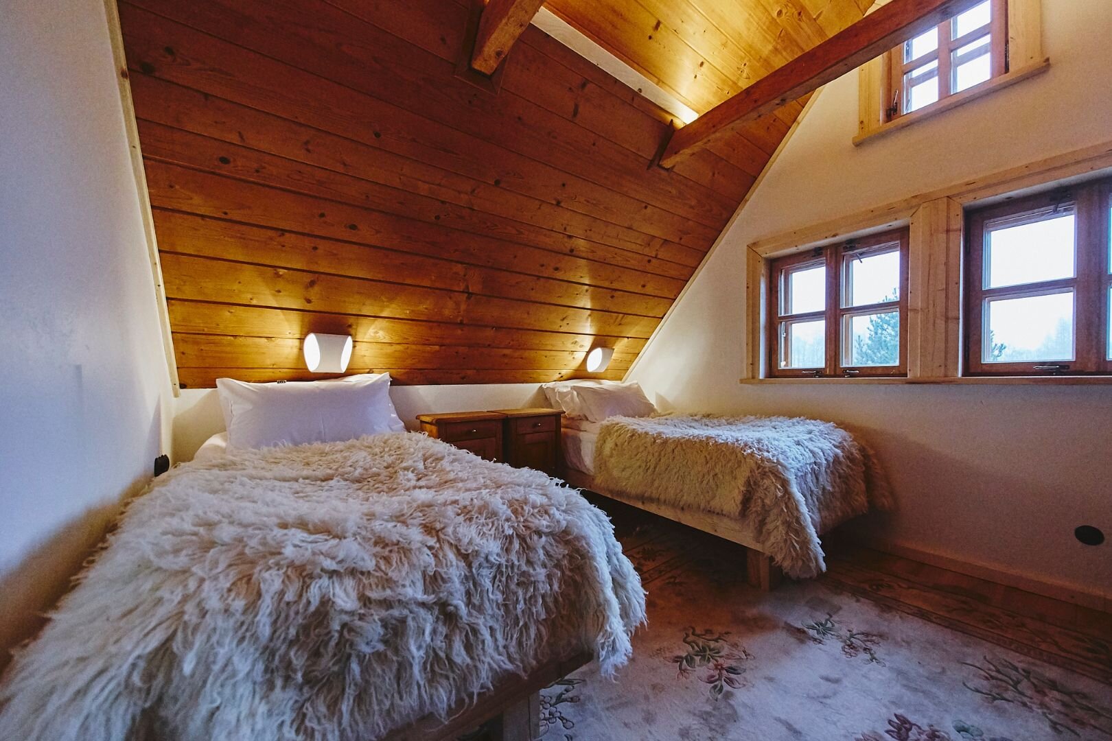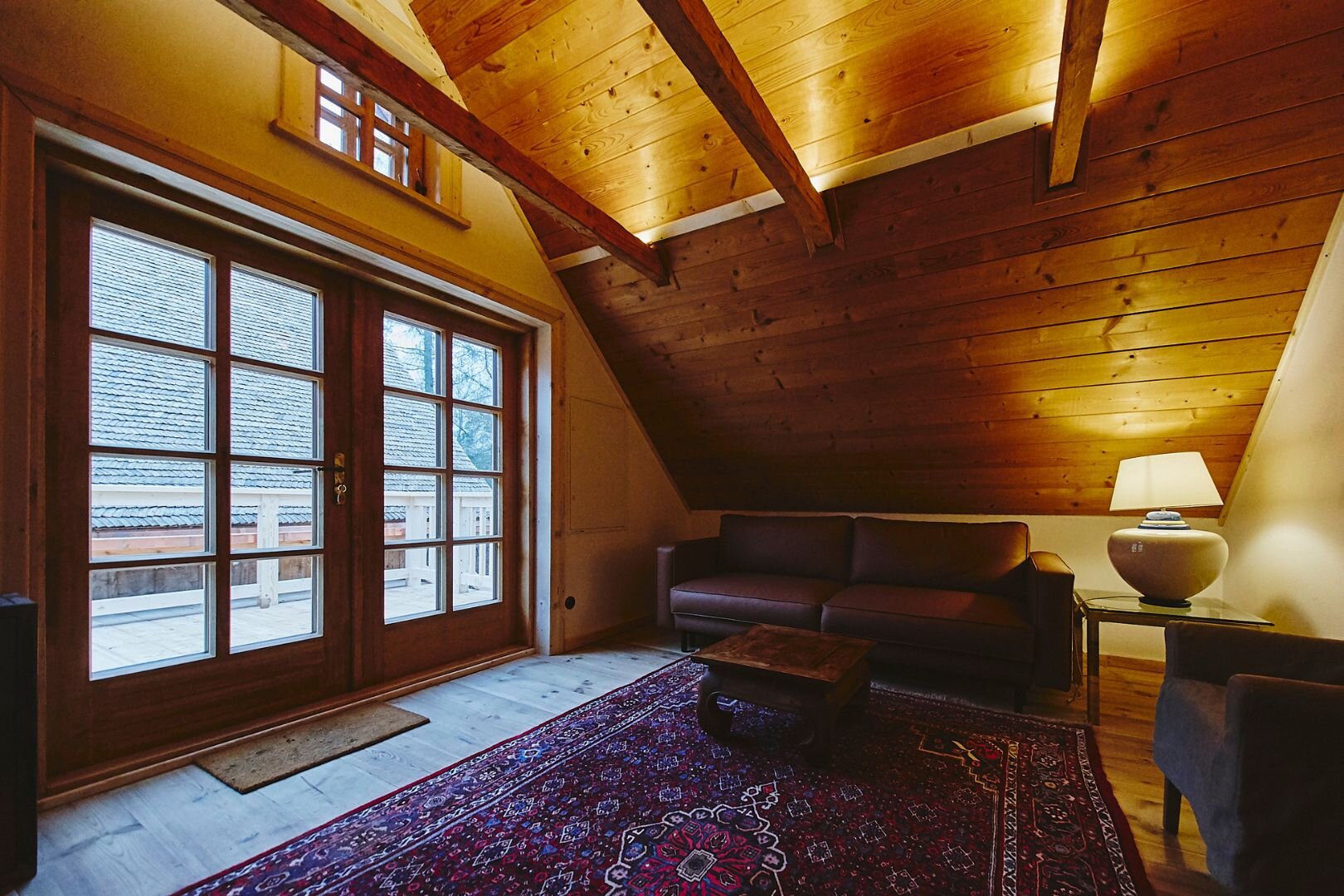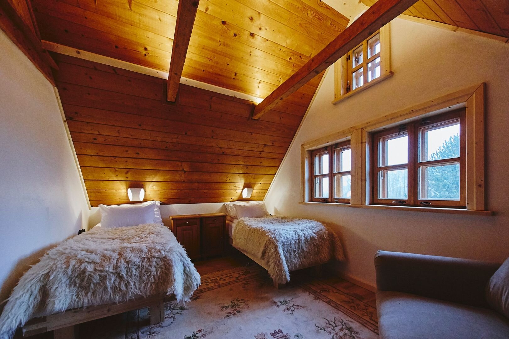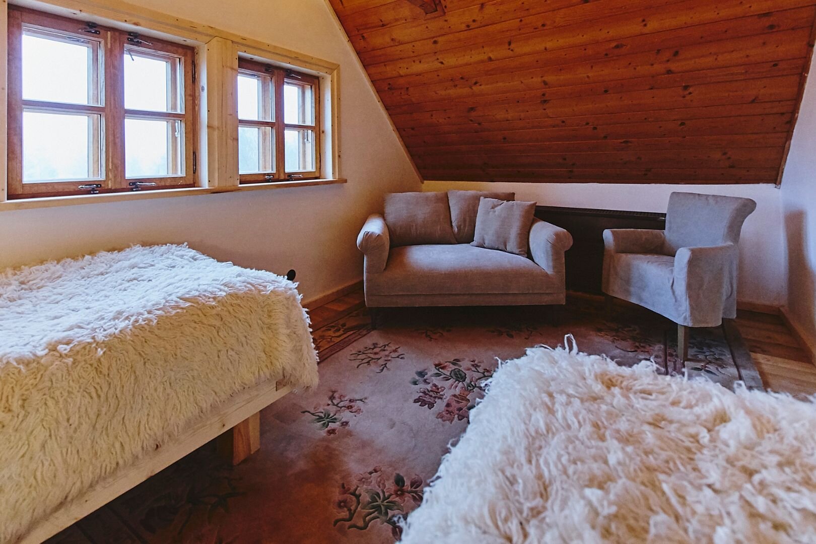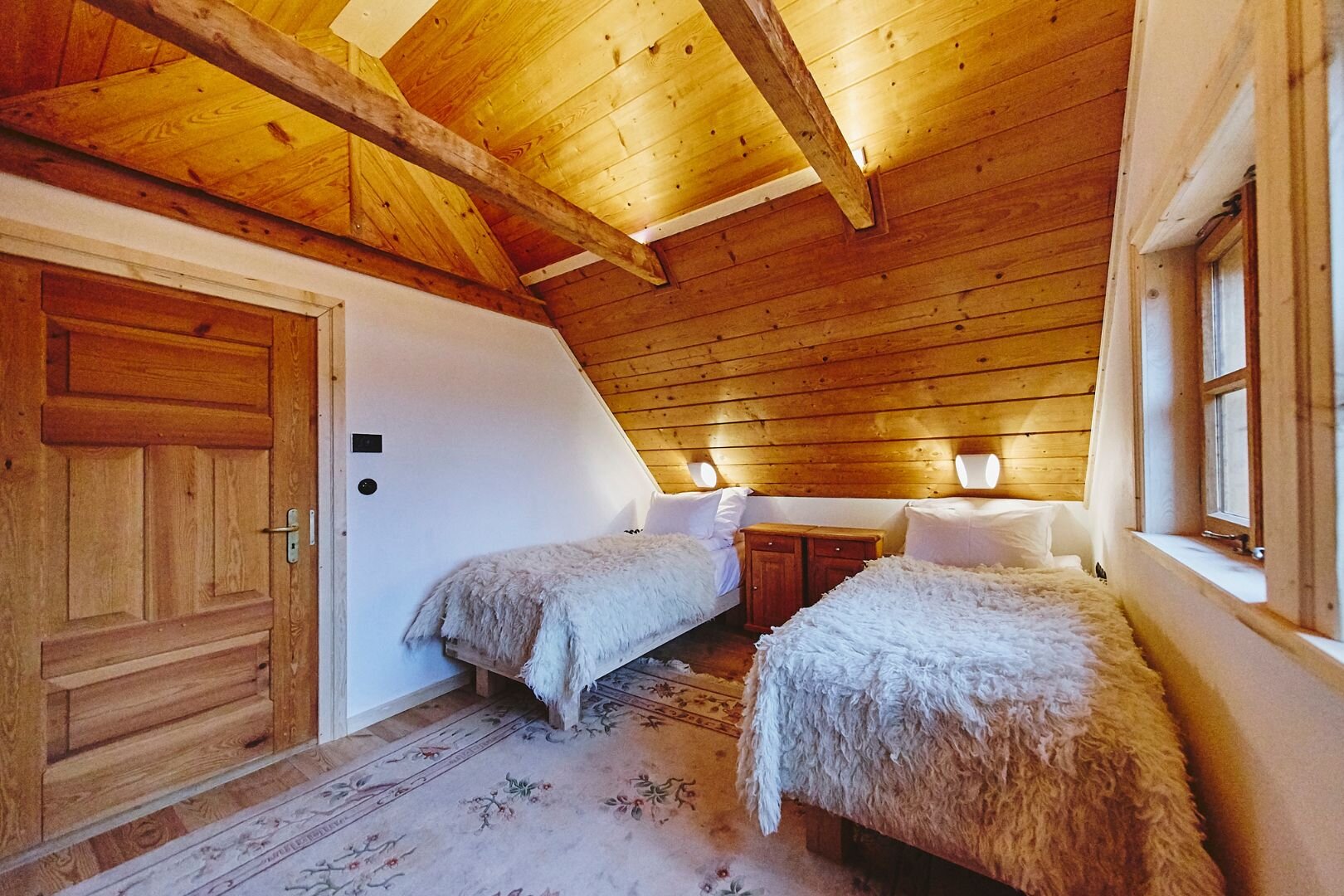 Pokój "Żuraw" to obszerne i przytulne wnętrze, idealne dla maksymalnie trzech osób. Oferuje komfortowe łóżko małżeńskie na antresoli oraz rozkładaną sofę. Luksusowa łazienka jest wyposażona w ręczniki, szlafroki i kosmetyki. Dodatkowo pokój posiada ekspre